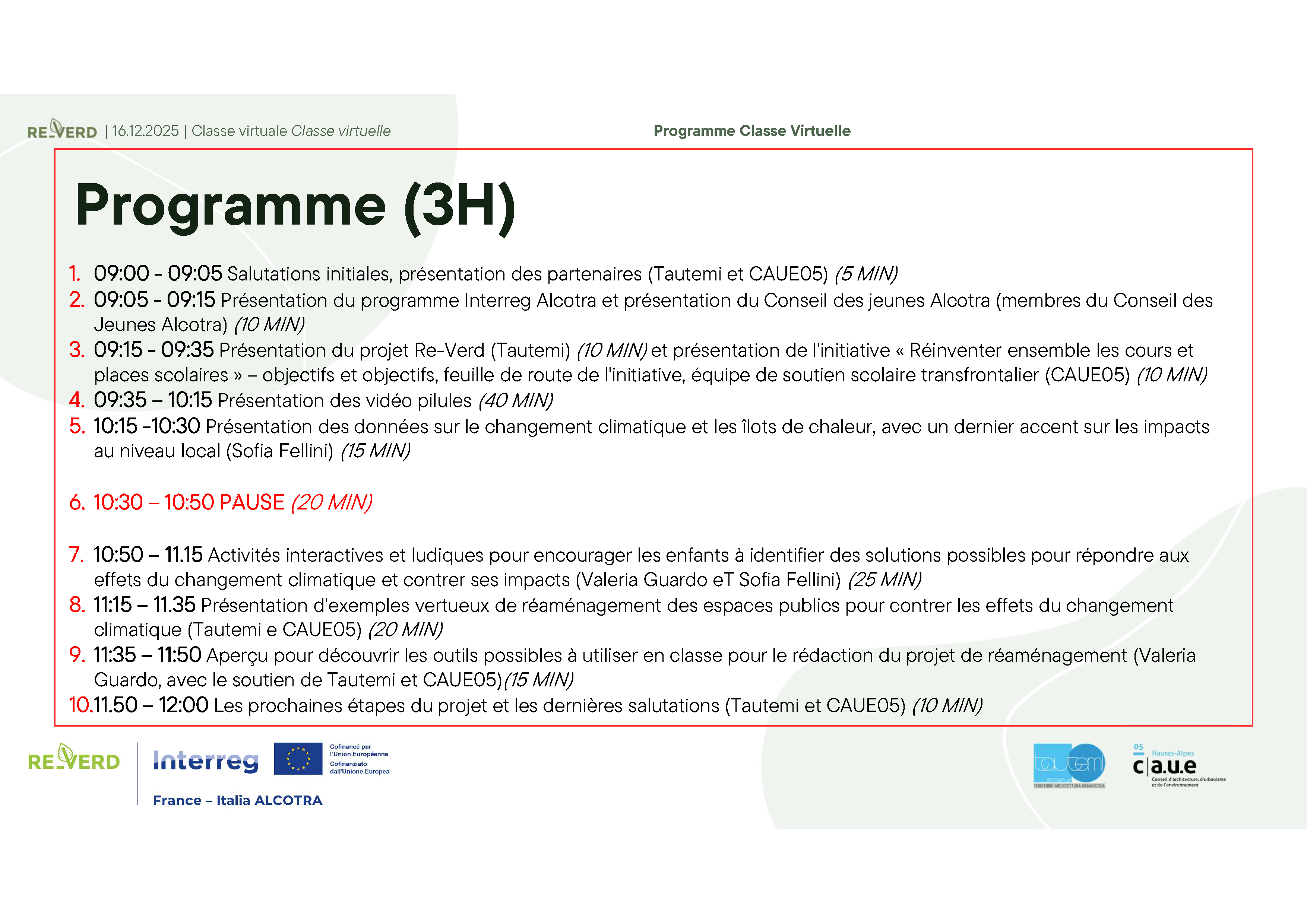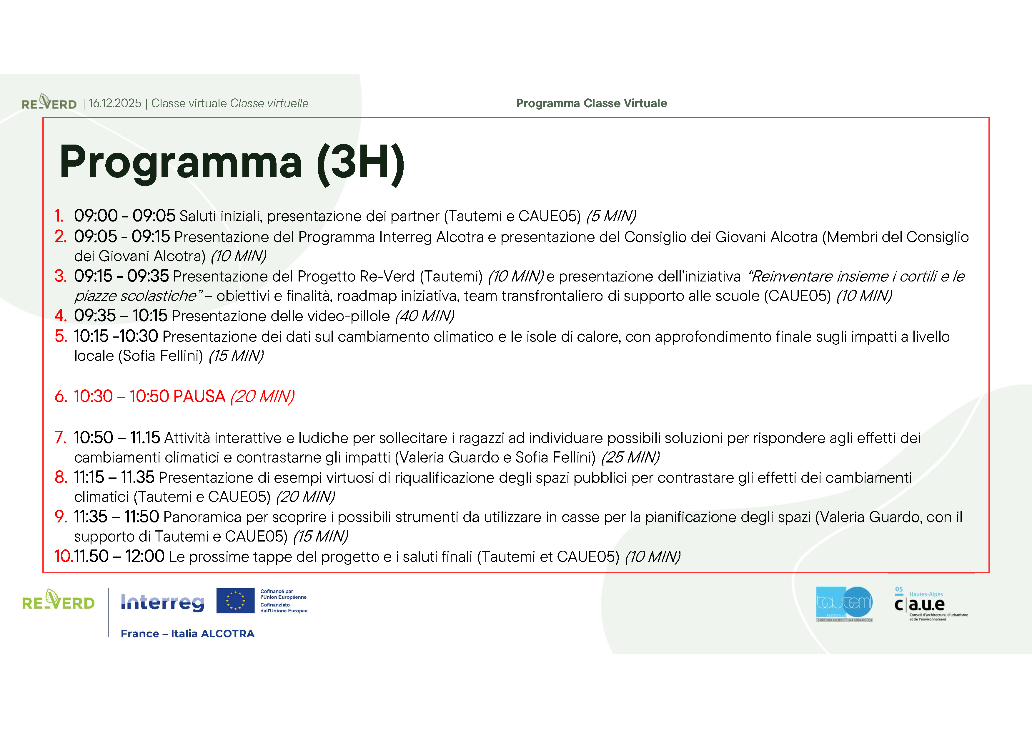 Tre ore di attività dinamiche e interattive animeranno la mattinata: laboratori, momenti di scambio e metodologie innovative pensate per stimolare la partecipazione attiva, aumentare la consapevolezza sugli effetti locali dei cambiamenti climatici e rafforzare il senso di appartenenza a uno stesso territorio transfrontaliero. Questa classe virtuale segna l’inizio del percorso di progettazione partecipata del progetto Re-verd. Nei prossimi mesi, ogni classe sarà accompagnata nell’elaborazione di una proposta di riqualificazione del cortile o della piazza scolastica, con l’obiettivo di rendere questi spazi più resilienti agli effetti del cambiamento climatico.